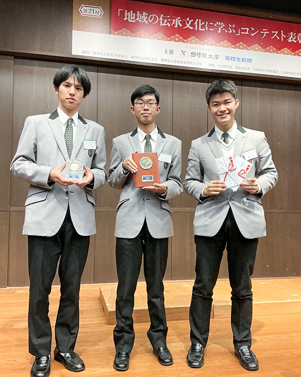 國學院大學・高校生新聞社主催 第21回「地域の伝承文化に学ぶ」コンテストにおいて、地理・歴史部の3年の堤彰人さん、2年の山口優さん、廣岡明憲さんの3名が、「三島の郷土民謡農兵節について」のテーマで研究調査して応募した結果、地域文化研究部門(団体)で「最優秀賞」及び全体の最高賞である「折口信夫賞」(全国1位)を受賞しました。